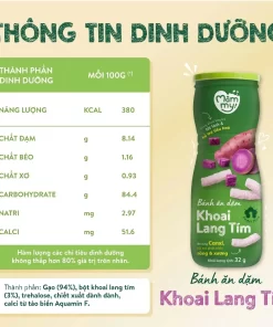 Bánh ăn dặm khoai lang tím Mămmy là món ăn nhẹ dinh dưỡng lý tưởng cho bé từ 6 tháng tuổi trở lên, giúp bé làm quen với thức ăn rắn một cách dễ dàng và an toàn. Được làm từ khoai lang tím tự nhiên kết hợp cùng gạo Japonica cao cấp, bánh mang vị ngọt dịu nhẹ, thơm ngon, dễ tan trong miệng, phù hợp với hệ tiêu hóa còn non nớt của bé.