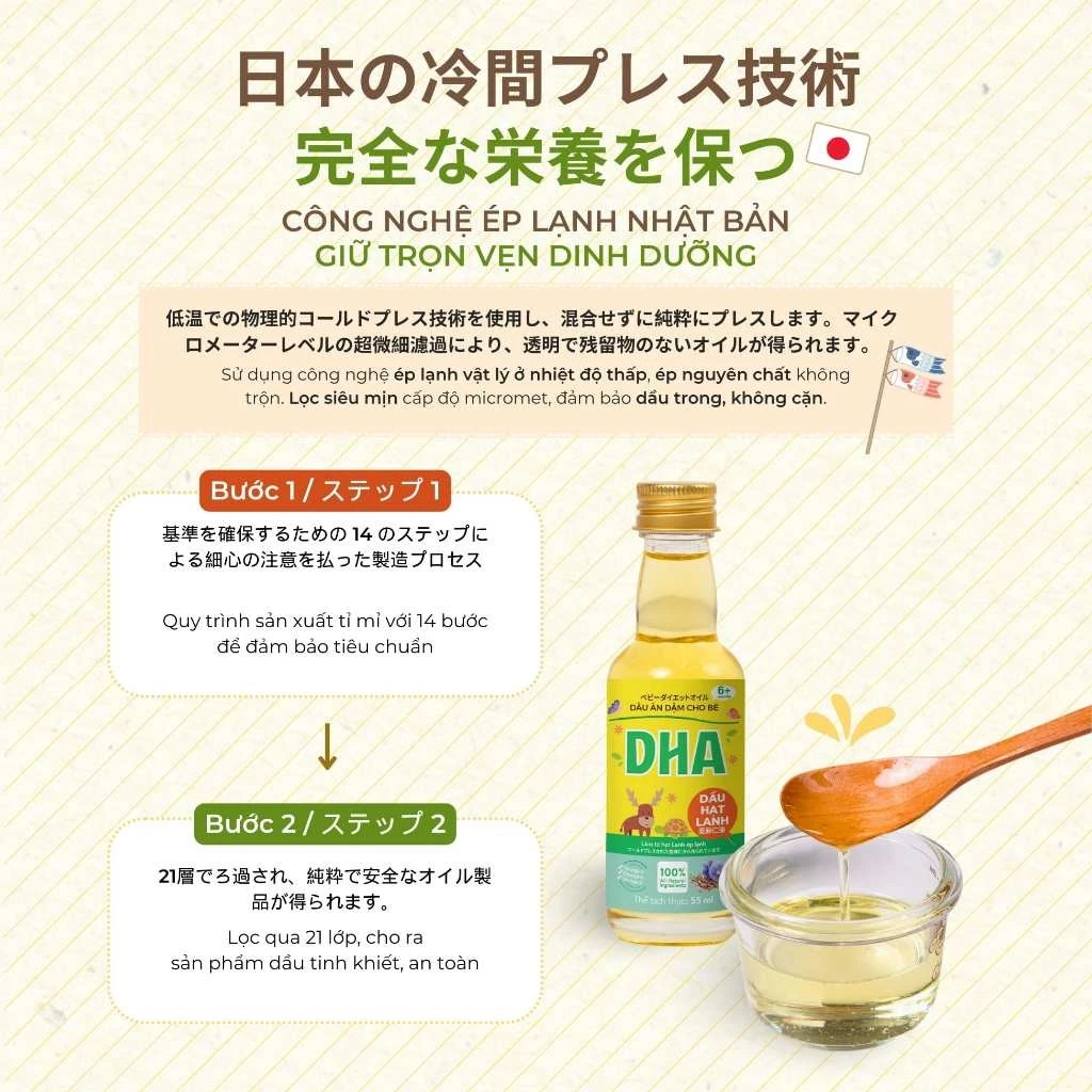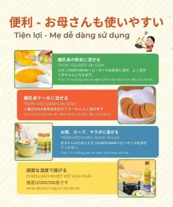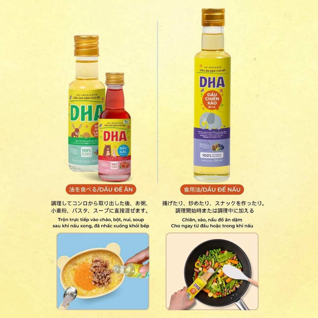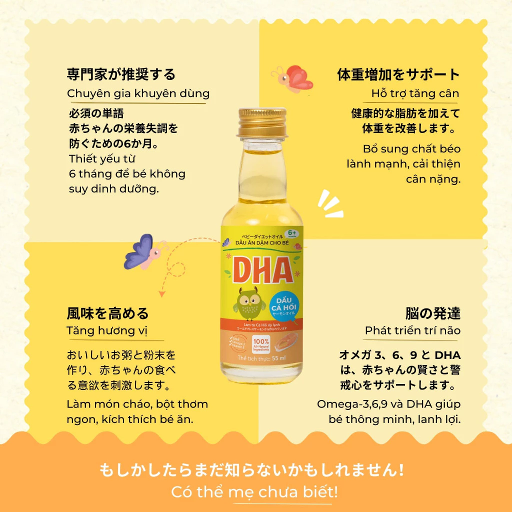 • Dầu ăn dặm DHA cho bé là lựa chọn hoàn hảo giúp bổ sung dưỡng chất thiết yếu cho trẻ trong giai đoạn ăn dặm từ 6 tháng tuổi trở lên.