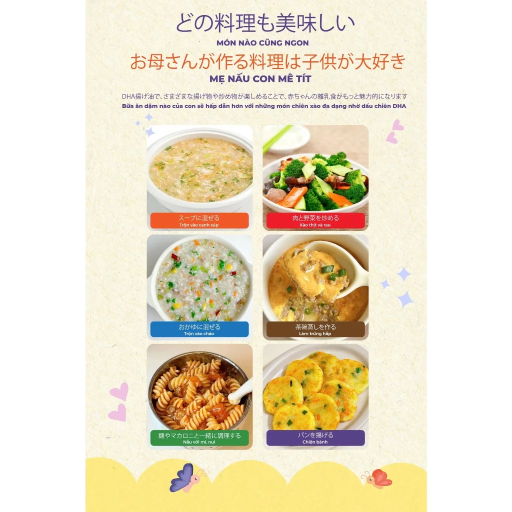 Dầu Chiên Xào DHA Cho Bé là sản phẩm cao cấp đến từ Nhật Bản, được nghiên cứu dành riêng cho trẻ nhỏ trong giai đoạn ăn dặm và phát triển toàn diện.