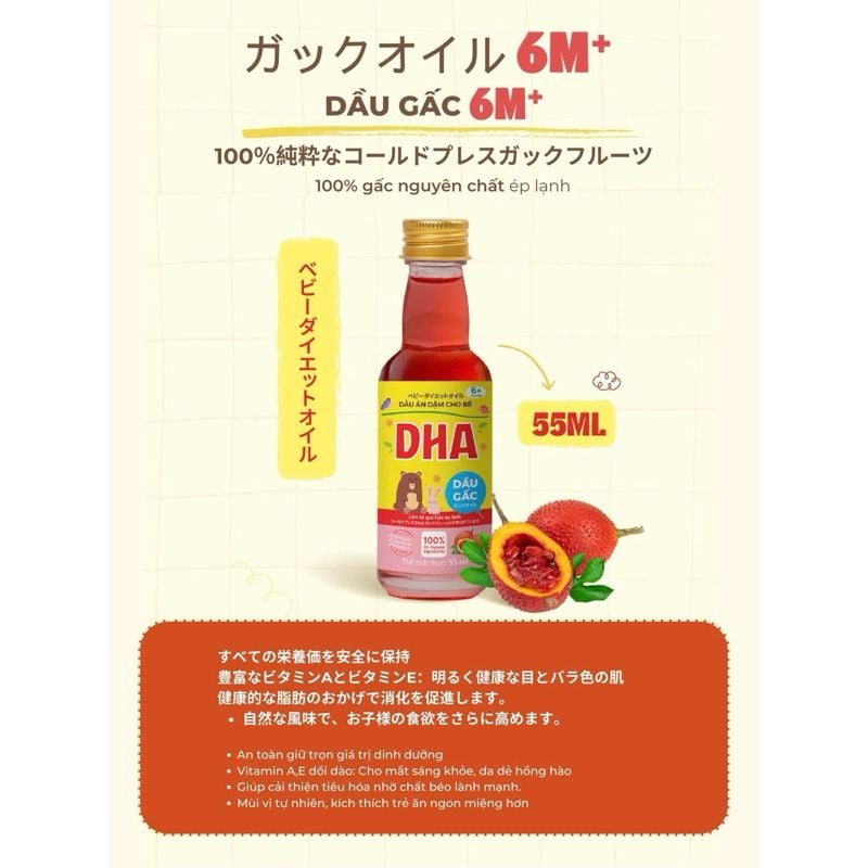 👉 Dầu Gấc DHA 6M+ – lựa chọn hoàn hảo cho mẹ muốn bổ sung DHA, Vitamin A & E tự nhiên giúp bé sáng mắt, hồng da, khỏe mạnh và phát triển toàn diện ngay từ giai đoạn ăn dặm đầu đời.